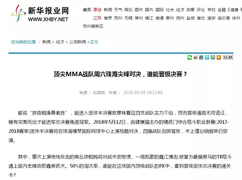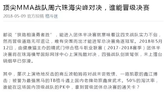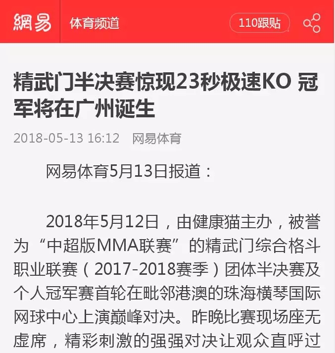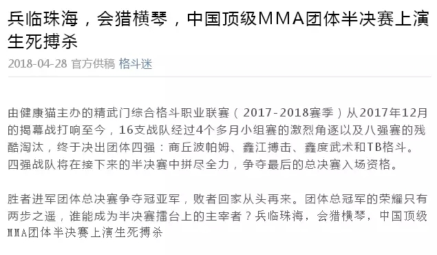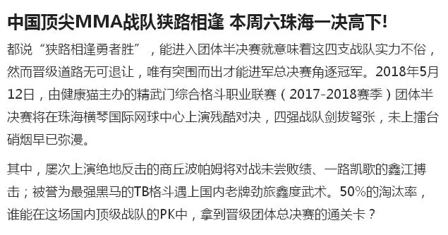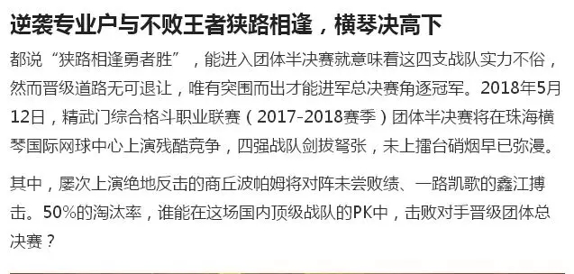 2018年5月12日,精武門綜合格斗職業(yè)聯(lián)賽(2017—2018賽季)團(tuán)體半決賽在珠海橫琴國際網(wǎng)球中心圓滿落幕。鑫江搏擊3:2險(xiǎn)勝商丘波帕姆,成功拿到團(tuán)體總決賽的入場券。