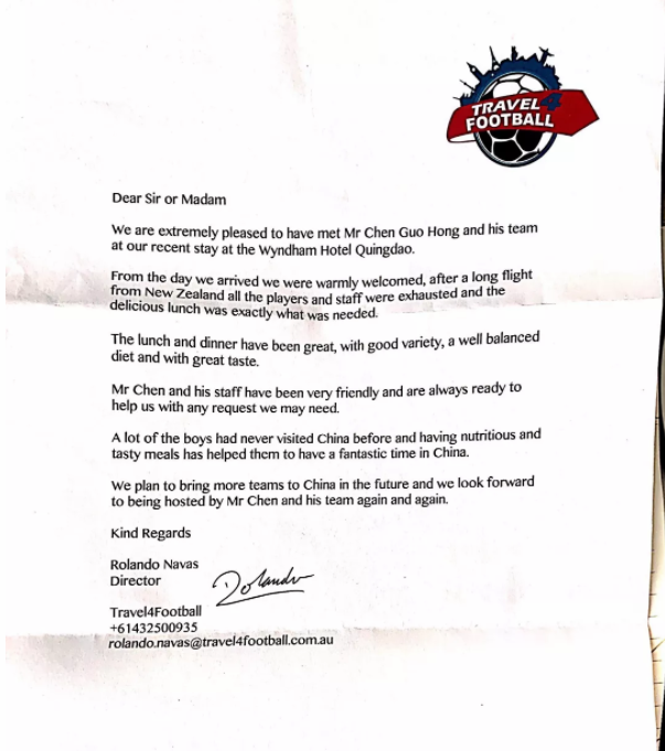 青島鑫江溫德姆酒店團隊,辛勤的服務(wù)和付出和努力,得到了入住球隊的認可。我們收到了來自澳大利亞球隊秘書,及新西蘭球隊理事的書面感謝信。大家對酒店廚師長,及廚師團隊表達了親切的問候與感謝,特別對酒店健康、豐富的食材,搭配均衡的三餐,以及親情化的服務(wù)表達了感謝。新西蘭球隊理事,更是希望以后在中國的團隊,都由溫德姆酒店提供服務(wù)。