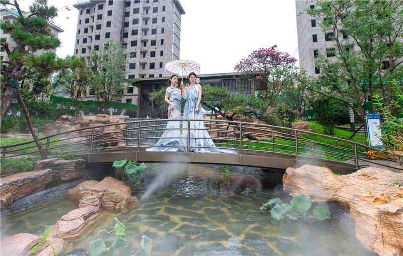 雨中的歆湖云霧繚繞,臥虹橋仿佛在訴說一段古老而美麗的故事。中式園林中,身著精美古裝的佳人仕女,曼妙若畫,在旖旎的禮樂中上演一曲醉人如夢,將示范區的東方之美和風華絕代淋漓盡致地展現于眼前。攬勝軒內,精心準備的茶藝表演讓在場嘉賓沉醉其中,品茗、賞景、談笑風生。