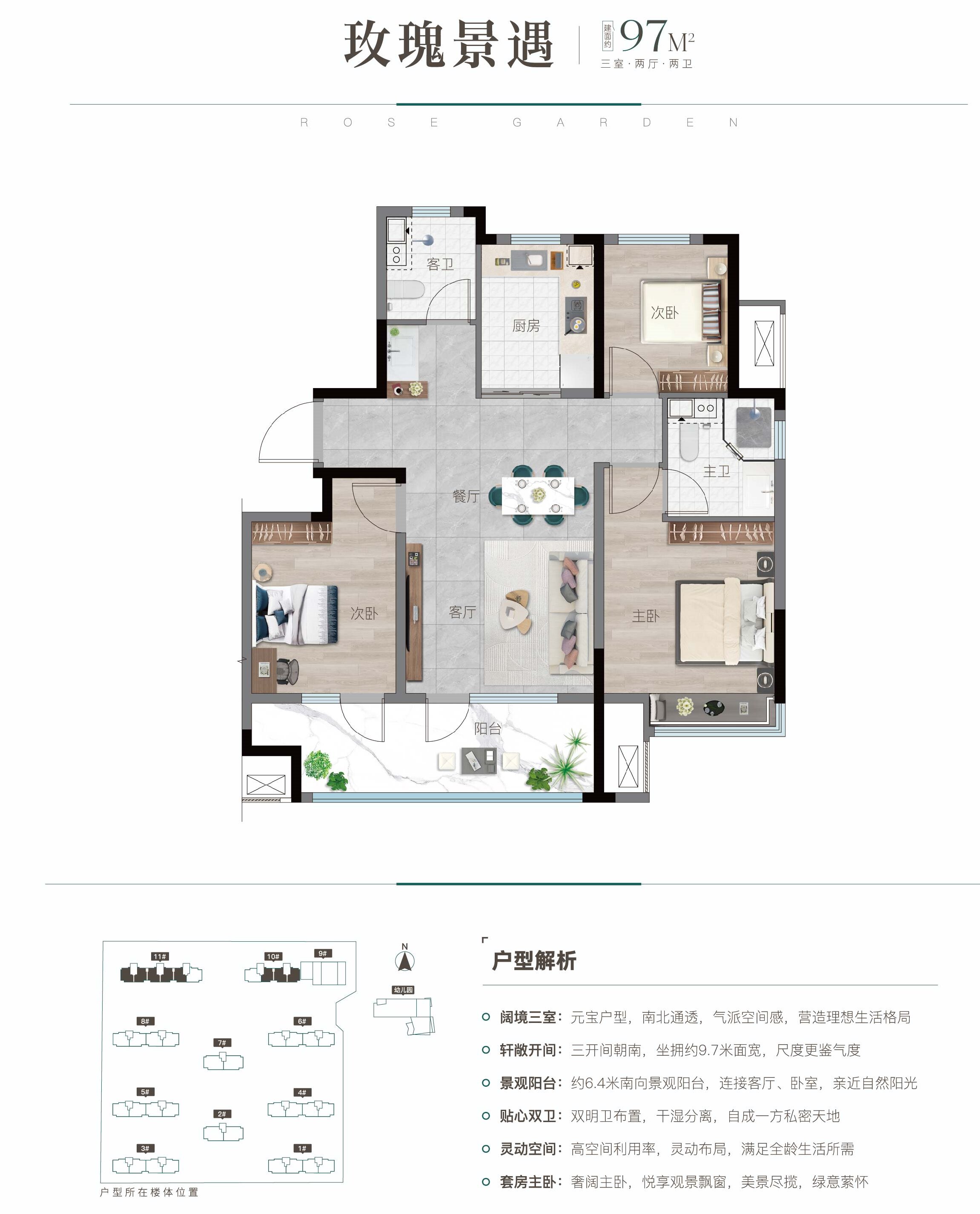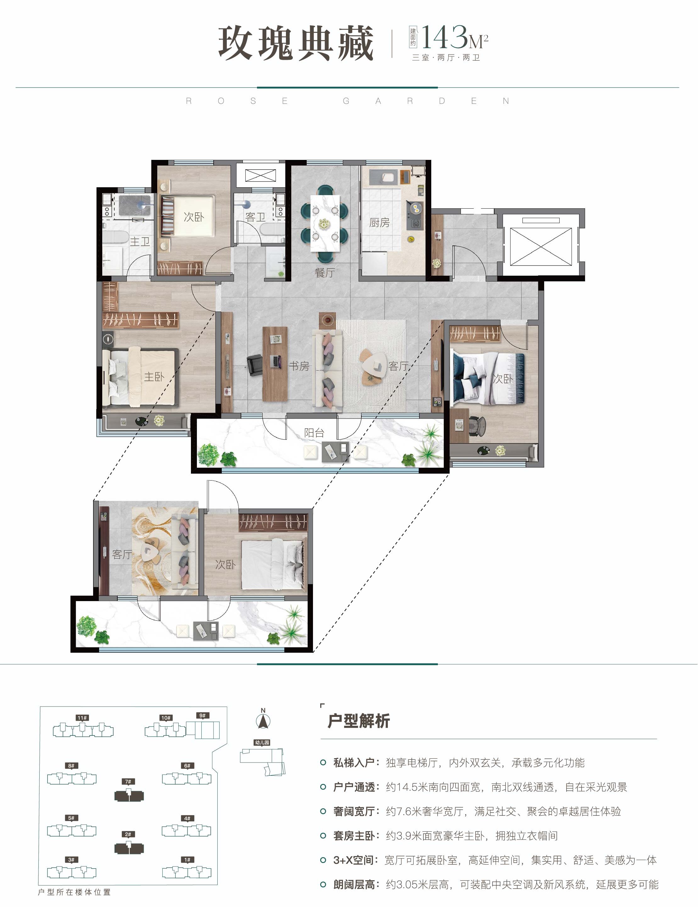 項目共計418戶,規劃面積97-143㎡戶型最大14.5米南向面寬。外立面采用新古典風格,刪繁就簡,簡約大氣,社區內部打造超萬平中央景觀,對標豪宅藏品級園林,呈現罕見園林奢景,以及更多重的生活功能場景。構建“一軸兩芯多花園”五重歸家禮序、八大藝術景觀,營造16 大生活場景,多元空間,打造自然藝術新煙火生活,成就以魅力生活和輕松氛圍而聞名的生態居住區。